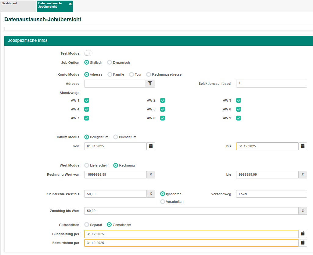 | Datum Modus Buchdatum: Erster_WSVJ bis Letzter WSVJ Kleinrechnungen: Verarbeiten Fakturdatum: Solldatum+1WT Buchdatum: Letzter_WSVJ |