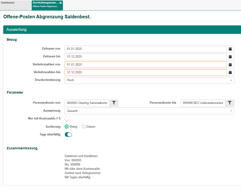 Die Erstellung von Saldenbestätigungen erfolgt unter Buchhaltung → Buchhaltungsauswertung → 16 Offene-Posten Abgrenzung Saldenbest.