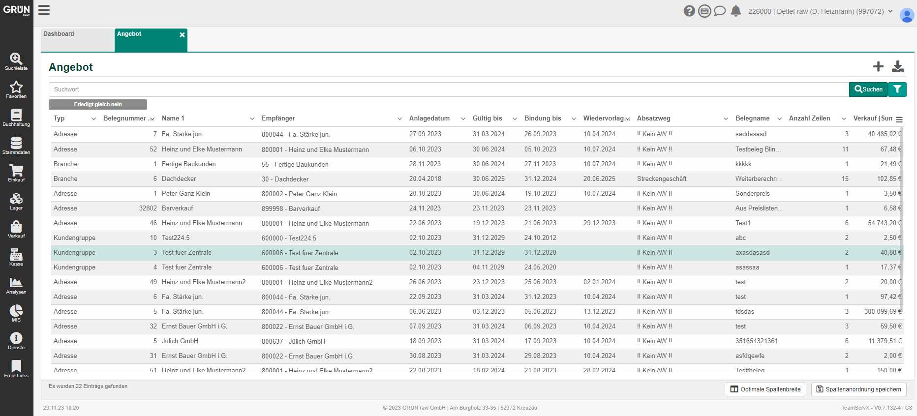 Prüfen Sie mit Hilfe von Infoauswertungen Ihre Angebote. Mit sF10 unter ASCII auf Kunde/ Branche/Familie lässt sich ein sog. Räumungslauf starten, der alle Angebote löscht, deren Gültigkeit um x-Tage überschritten ist. Mit sF12 unter ASCII lässt sich eine Artikelbereinigung vornehmen. Artikel, die nicht mehr im Artikelstamm vorhanden sind, werden gelöscht. Derartige Bereinigungen sollten grundsätzlich nicht im Tagesbetrieb durchgeführt werden.