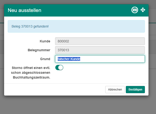 – Geben Sie im anschließenden Fenster Kundennummer, Belegnummer, den Stornogrund ein und akzeptieren das evtl. ein zurückliegender Buchungsmonat durch den Storno geöffnet wird.