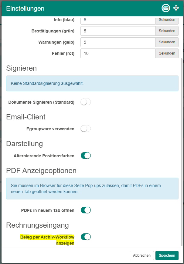 In den individuellen Nutzereinstellungen kann nun für die Rechnungskontrolle die Art der PDF-Anzeige der Eingangsrechnung geändert werden. Statt der im Standard angezeigten PDF kann dort nun auf die generelle Anzeige der Eingangsrechnung im Archiv umgeschaltet werden. Somit stehen bei Bearbeitung einer Rechnung auch direkt die Workflowfunktionen des Archivs zur Verfügung.