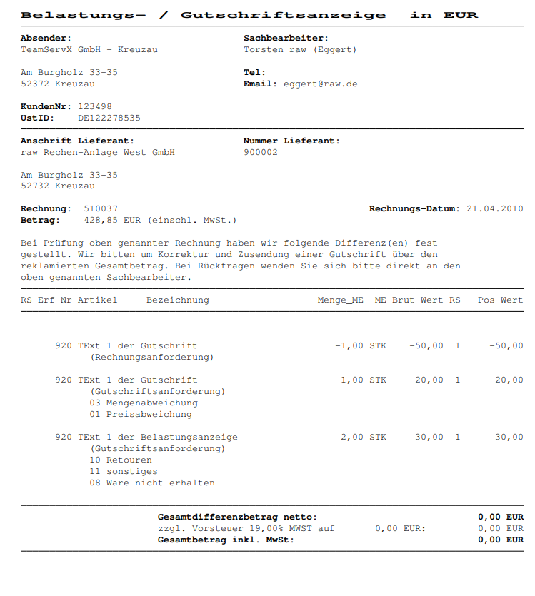 Bei Rechnungsdifferenzen ist unter Umständen die Anforderung einer Gutschrift beim Rechnungssteller erforderlich. Hierfür wurde in TeamServX ein automatisch generiertes PDF-Formular integriert. Dieses wird aus den Positionen vom Typ Gutschriftsanforderung und Belastungsanzeige erzeugt.Ausgegeben werden kann diese PDF über die Druck-/Seitenansichtsoptionen der Eingangsrechnung. Dort wurde eine entsprechende Optionen integriert.